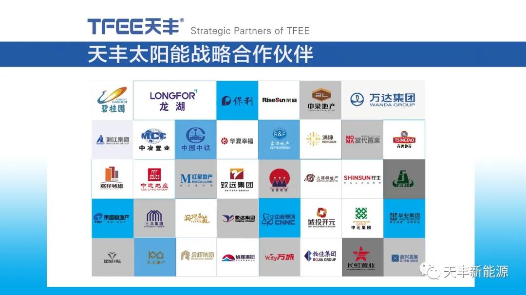產品力與服務力的雙重提升、對光熱行業20余年的專注積累、誠信務實的經營理念,讓合作伙伴對天豐新能源充滿信心,放心下單。得益于客戶對天豐品牌的口口相傳,天豐在市場的品牌知名度也在逐年擴大,特別是在樓盤配套清潔熱水領域,已經和碧桂園、龍湖地產、保利地產、中冶置業、中梁地產、中鐵、萬達等數十家知名房地產巨企建立了深度戰略合作關系。